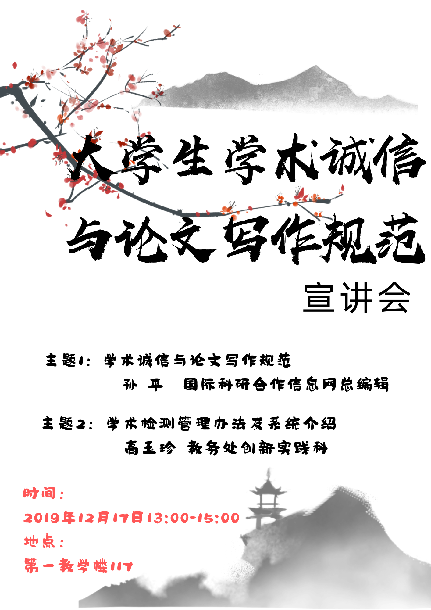 时间:2019年12月17日13:00-15:00地点:第一教学楼117内容:1.学术诚信与论文写作规范2.学术检测管理办法及系统介绍欢迎师生前来聆听!大学生学术诚信与论文写作规范宣讲会.png教务处2019年12月13日