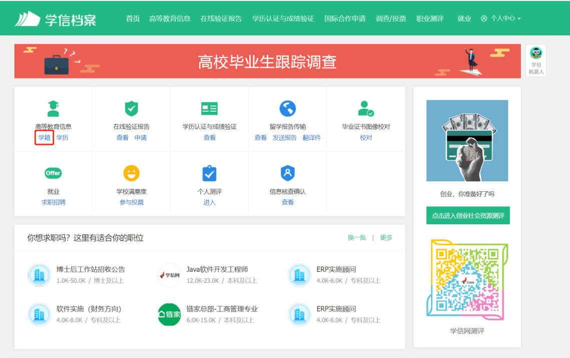 1.登录学信网APP,点击“学籍查询”,查看学籍学历信息